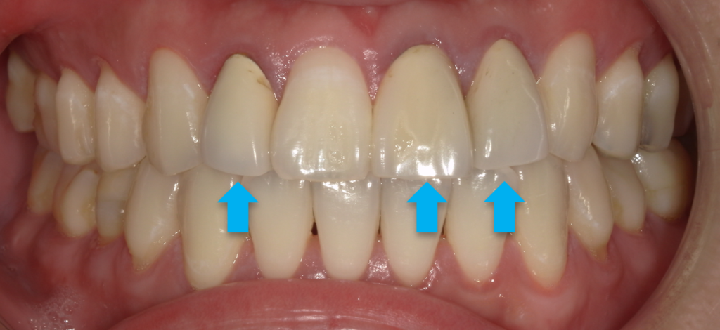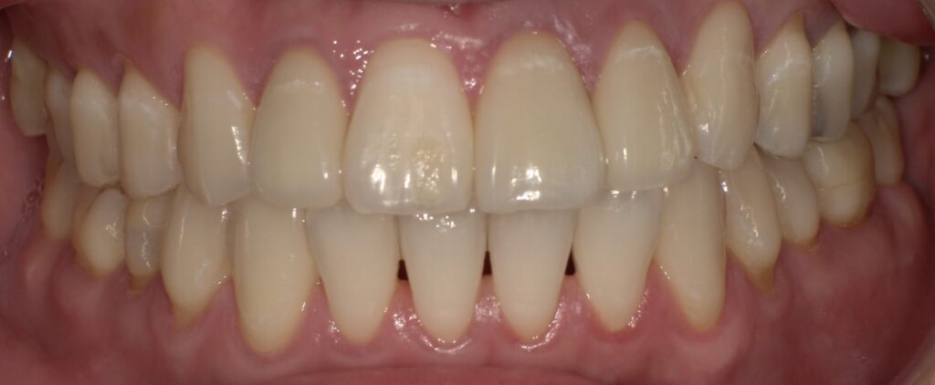 前歯の切縁にはホワイトスポットが確認できます。歯と歯の間には適合の悪いコンポジットレジン(保険の白い詰物)が充填されています。