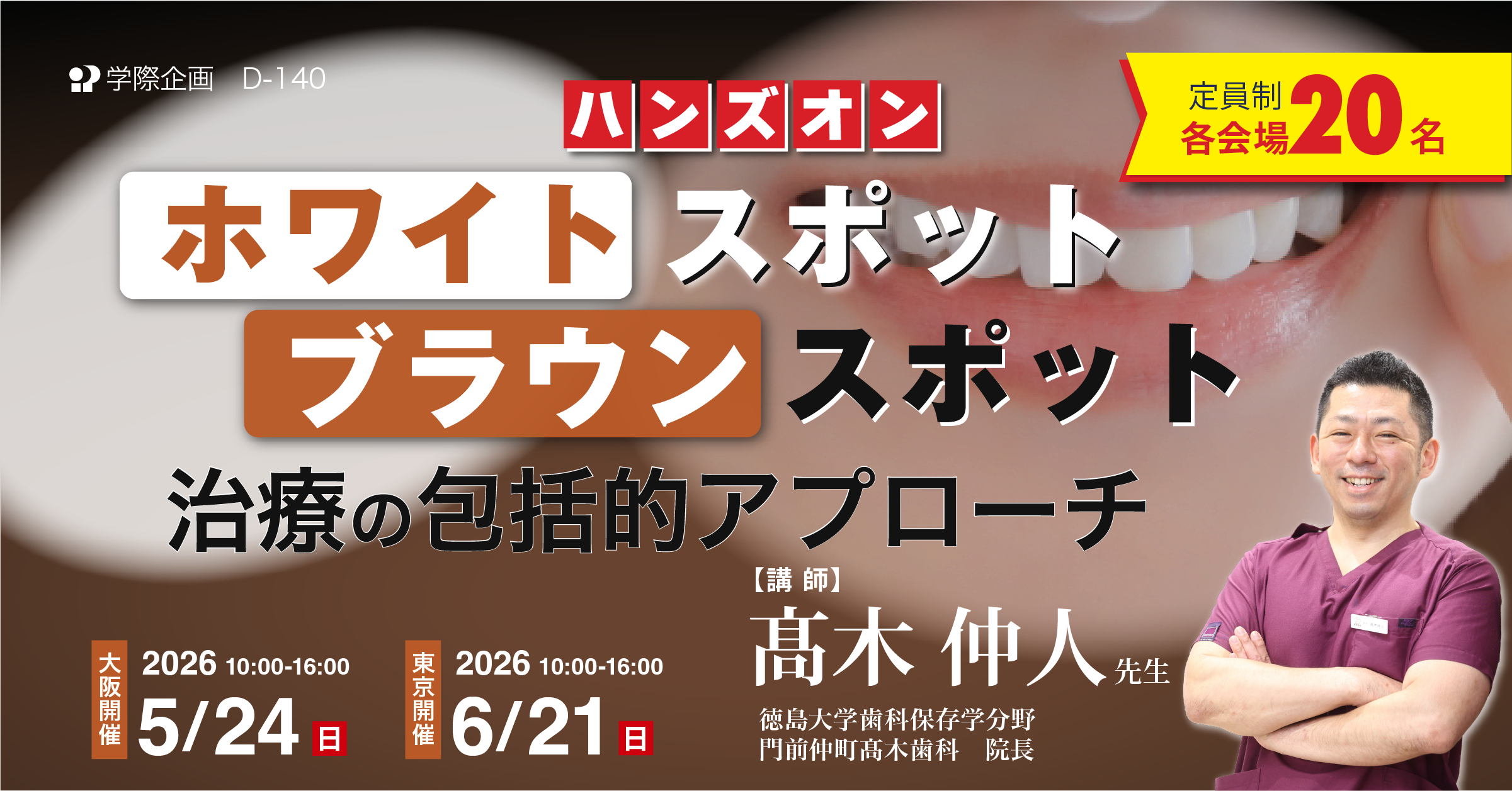 このたび学際企画主催セミナーにて、当院院長がホワイトスポットおよびブラウンスポットに対する包括的治療 について講演・ハンズオン指導を行います。 近年、前歯の白濁(ホワイトスポット)や褐色変化(ブラウンスポット)に対し、「削らずにどこまで改善できるか」という低侵襲審美治療への関心が高まっています。
